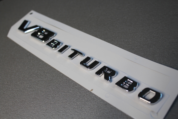 надпись V8 BITURBO от Mercedes 63 AMG с нанесенным двусторонним скотчем с обратной стороны. Выполнена в стиле 2015 года -.