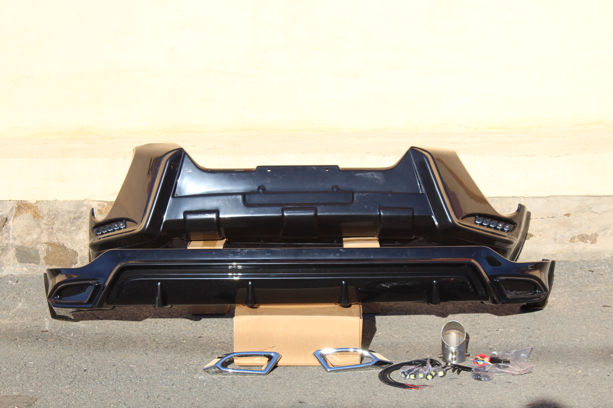 В комплекте: передняя губа, задняя губа, диодные ходовые огни , насадка на выхлоп, хромированные имитации выхлопа, весь необходимый крепеж.