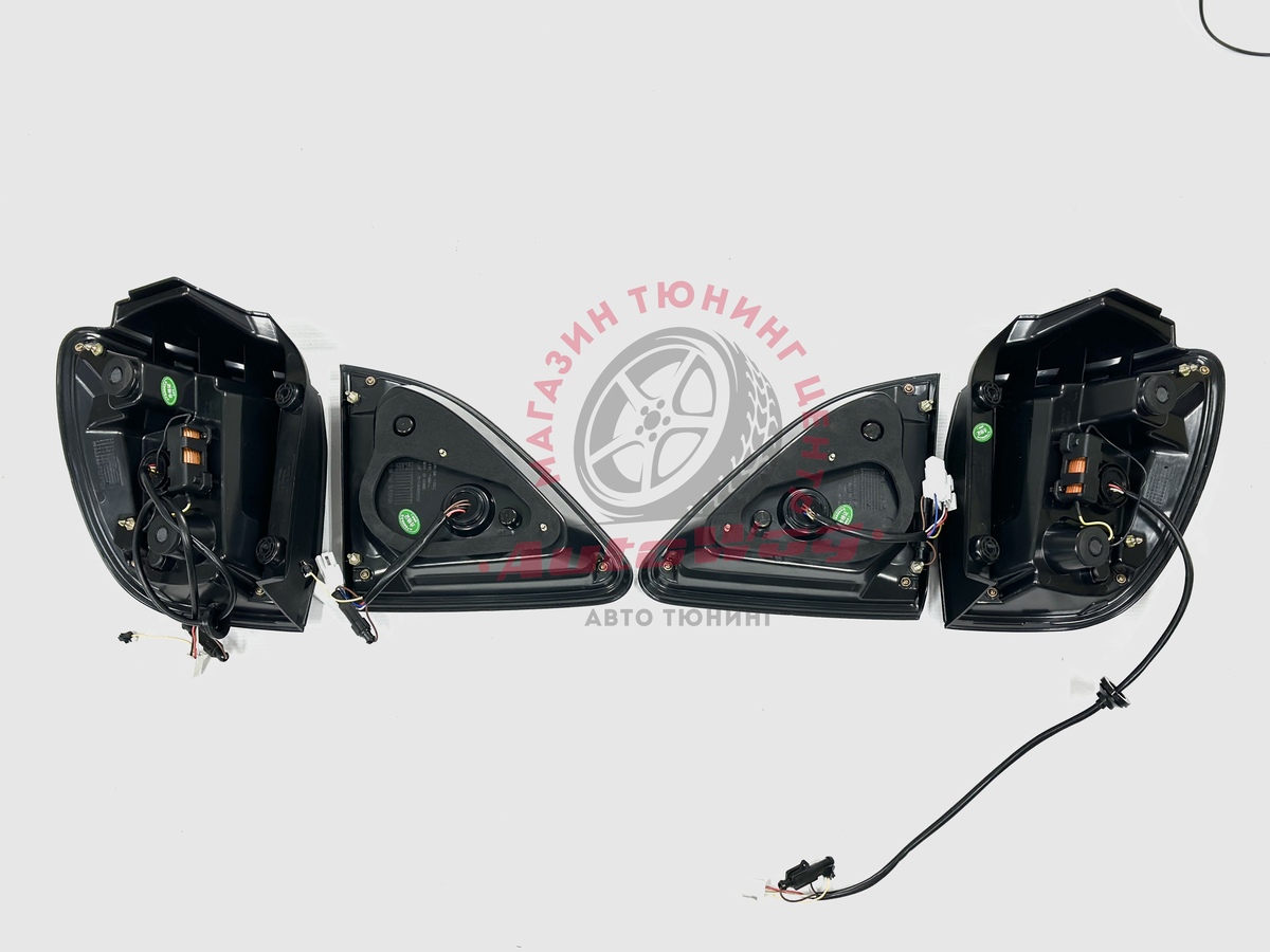Полностью светодиодные (LED), с функцией динамического приветствия, выходящий в габарит, яркий бегающий повторитель поворота, задний ход