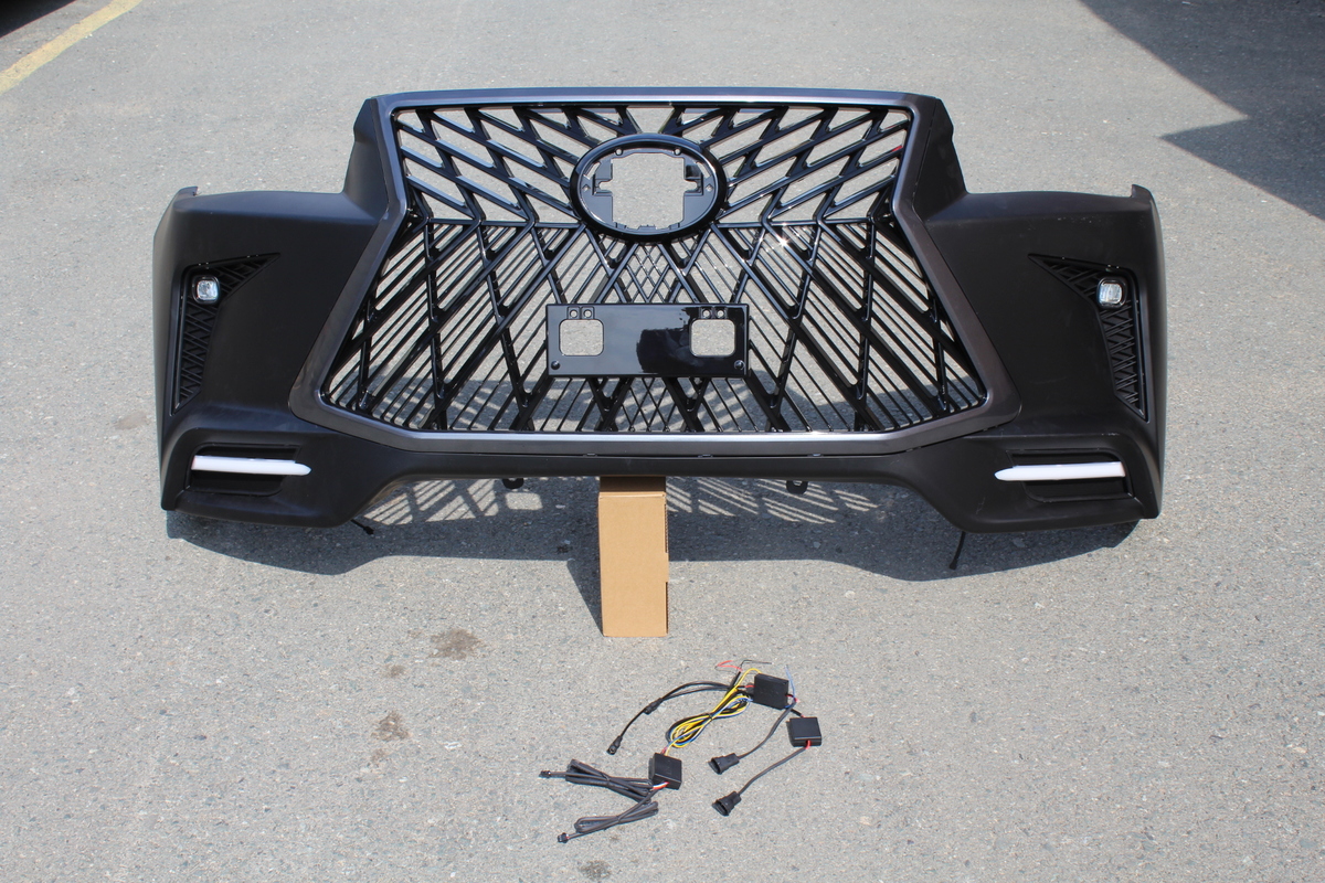 В комплекте : бампер пластик PP под покраску, решетка окрашена в черный цвет с серым молдингом, диодные туманки, ходовые огни (работают в еще в режиме "бегающего" повторителя поворота), провода с блоками для подключения.