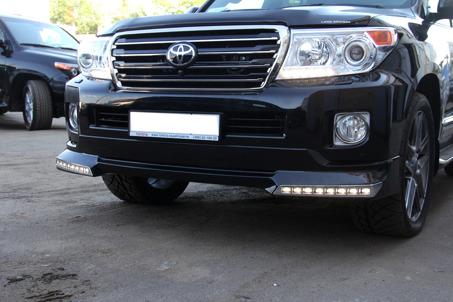 Губа передняя Land Cruiser 200, 2012-2015, Platinum Edition с диодными ходовыми огнями, цвет черный.
