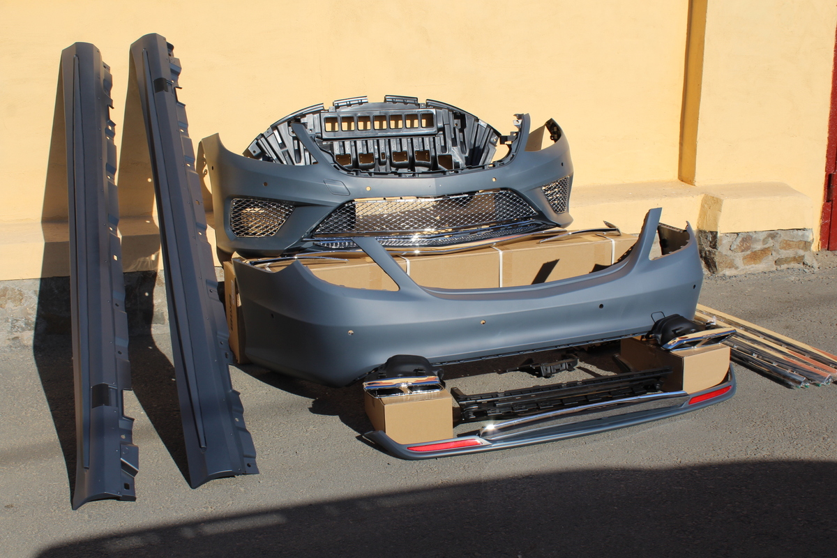 В комплекте: Передний бампер в сборе с хром решетками, задний бампер с диффузором и катафотами, защита двигателя, пороги с хром накладками, две насадки на выхлоп , накладка под номер и крепления.
