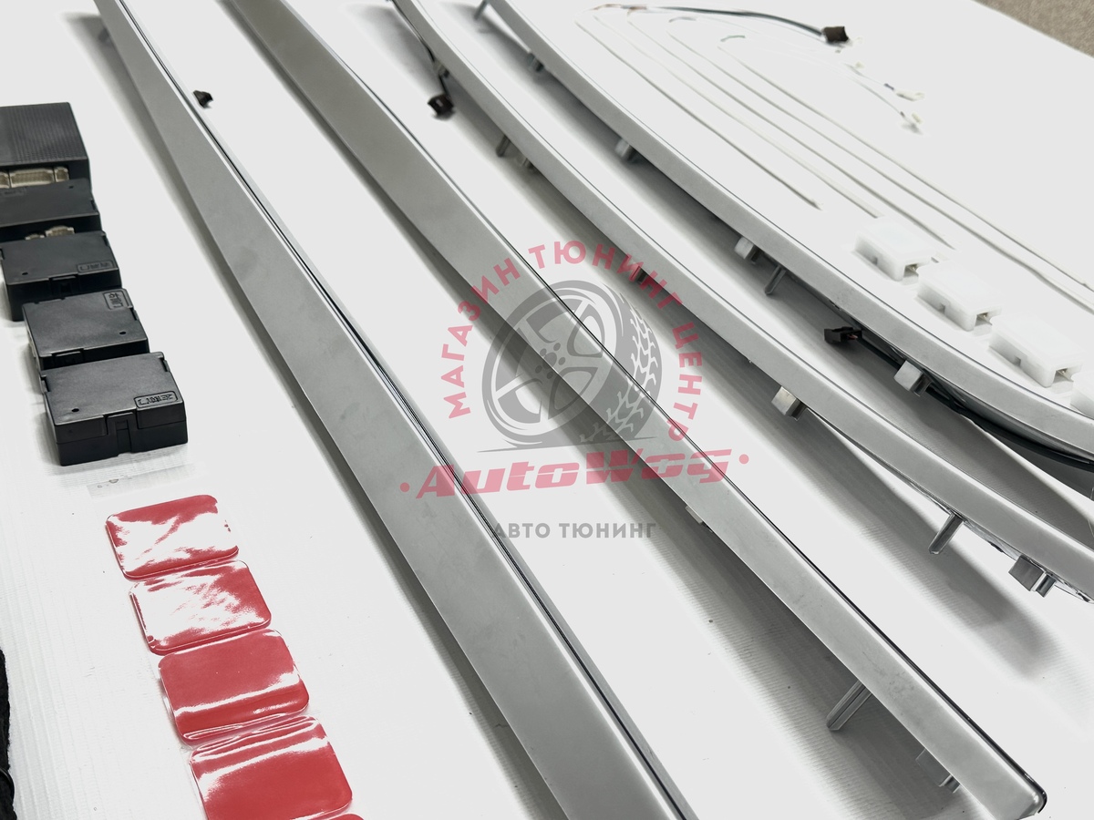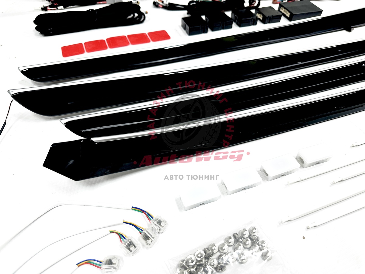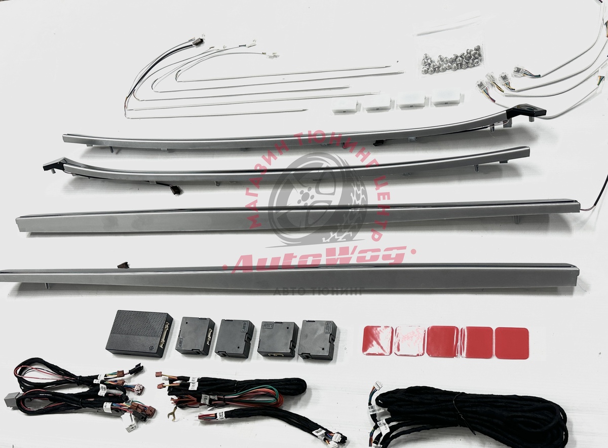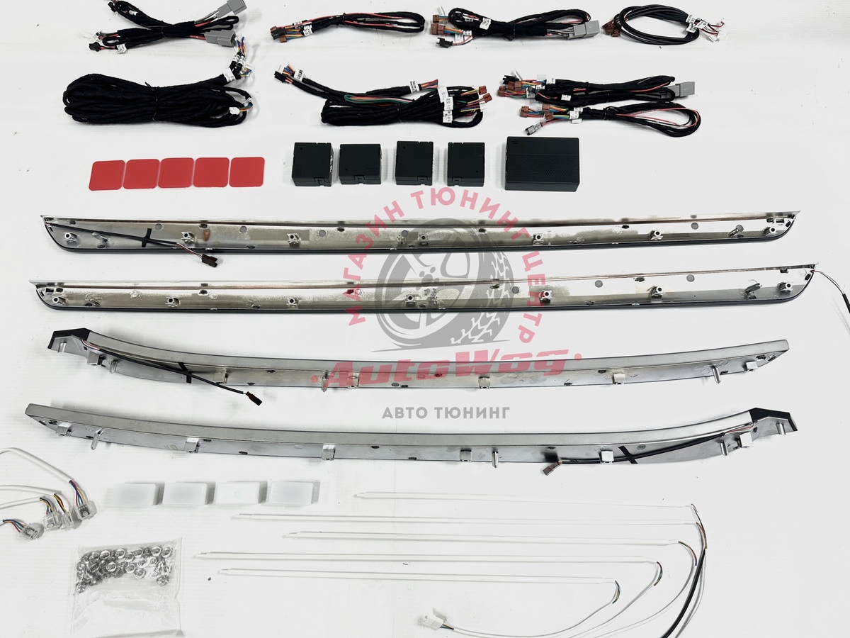 В комплекте: накладки на дверные карты (4 шт. в черном глянце с серебристой вставкой), провода для подключения + блоки управления, подсветка в кармашки, ноги, диодная лента для панели спереди из 5 шт.