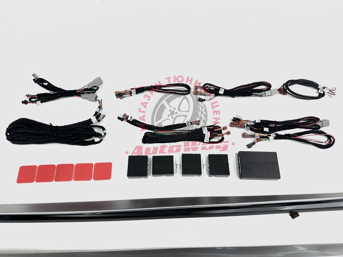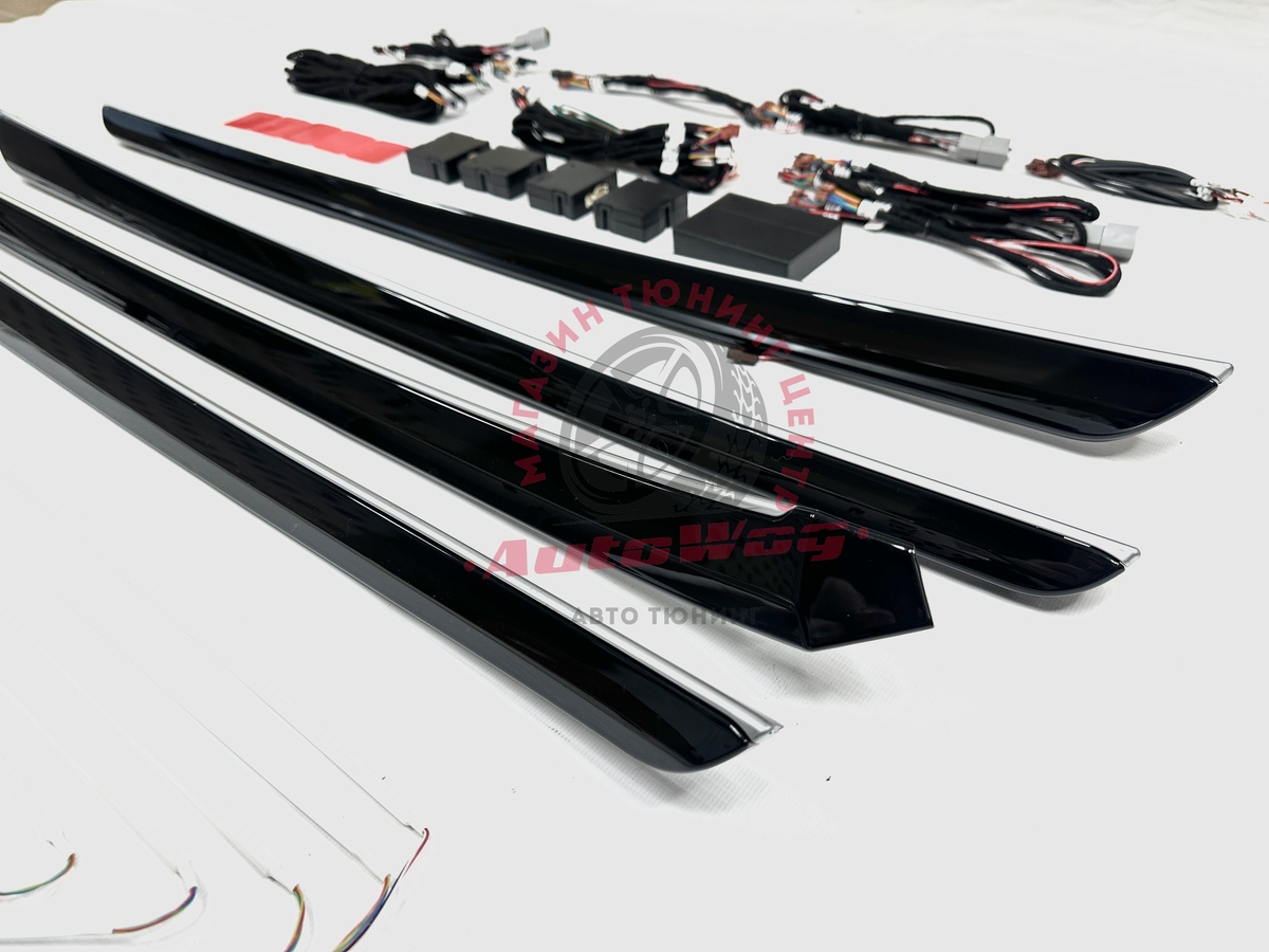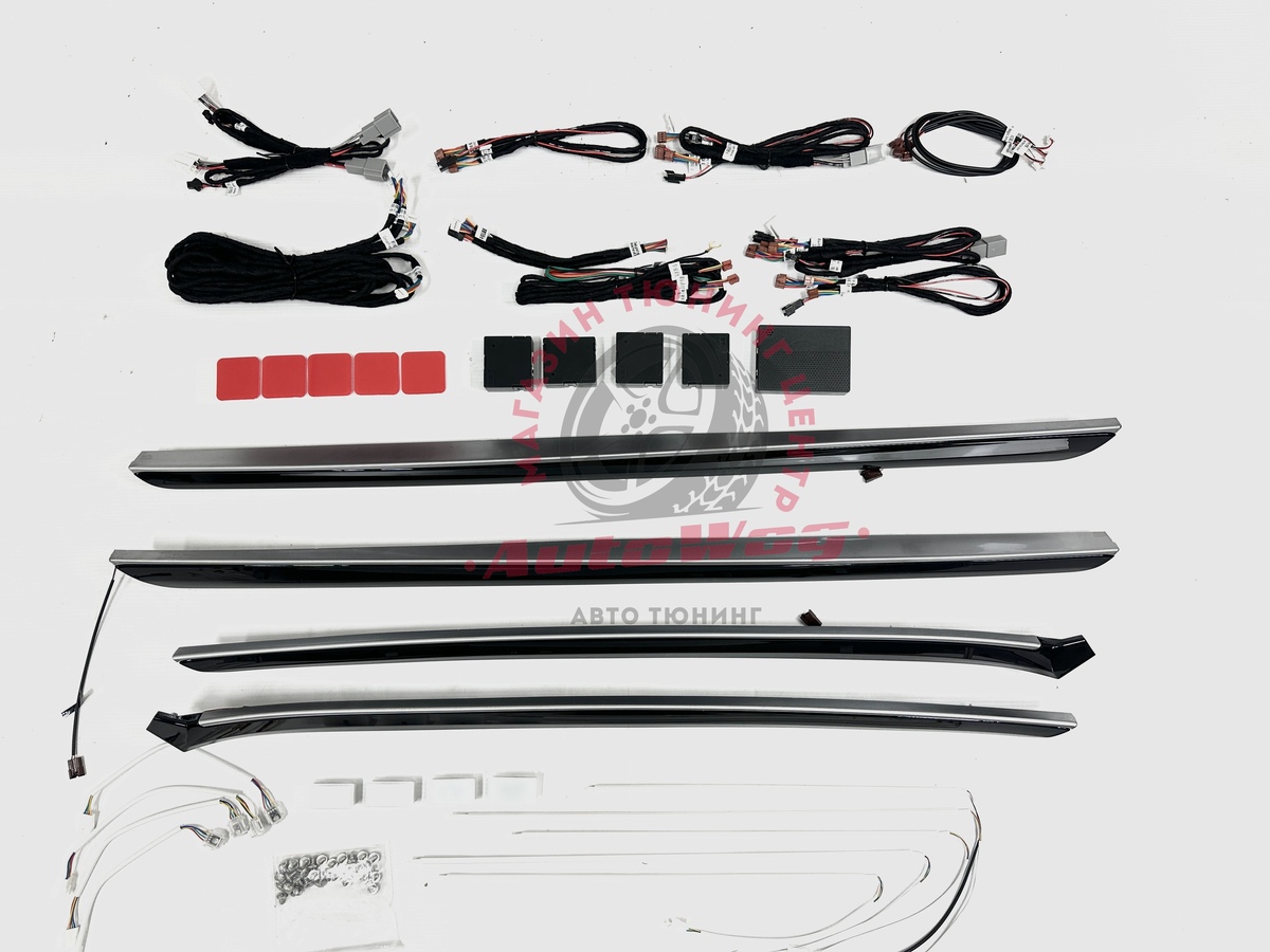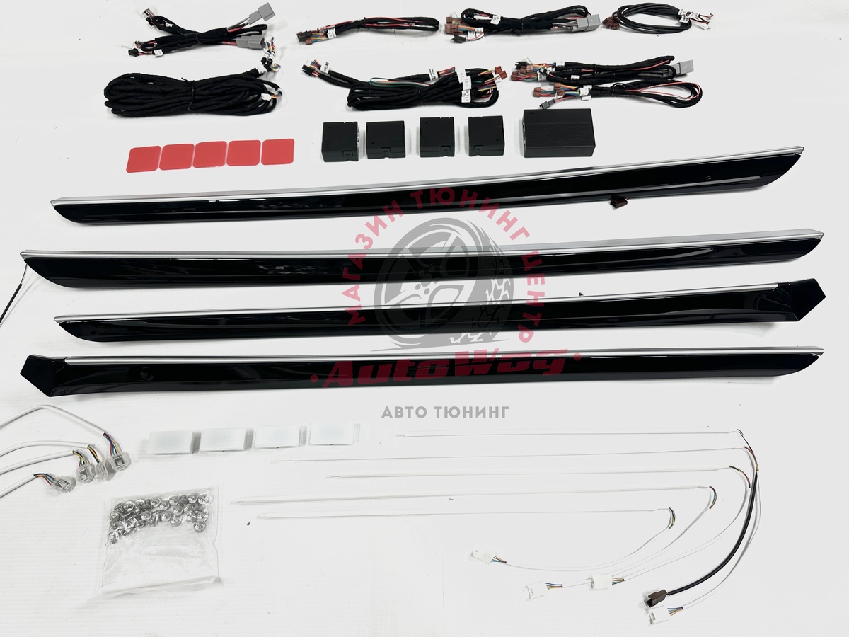В комплекте: накладки на дверные карты (4 шт. в черном глянце с серебристой вставкой), провода для подключения + блоки управления, подсветка в кармашки, ноги, диодная лента для панели спереди из 5 шт.