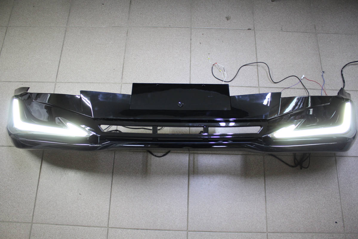губа передняя Prado 120, дизайн Modellista с ходовыми огнями + повторителем поворота. Режим работы повторителя-"бегающий". Окрашена в черный цвет