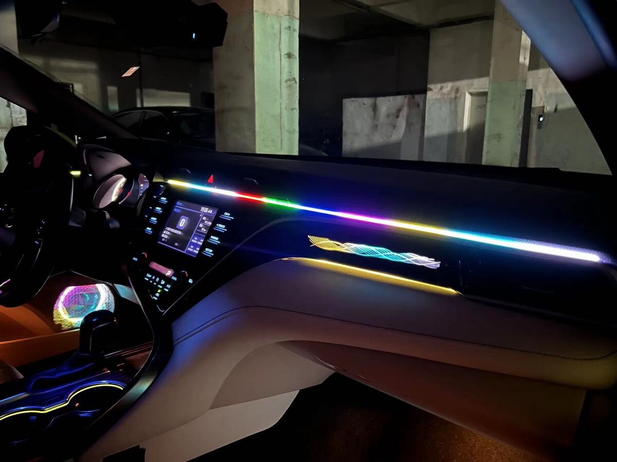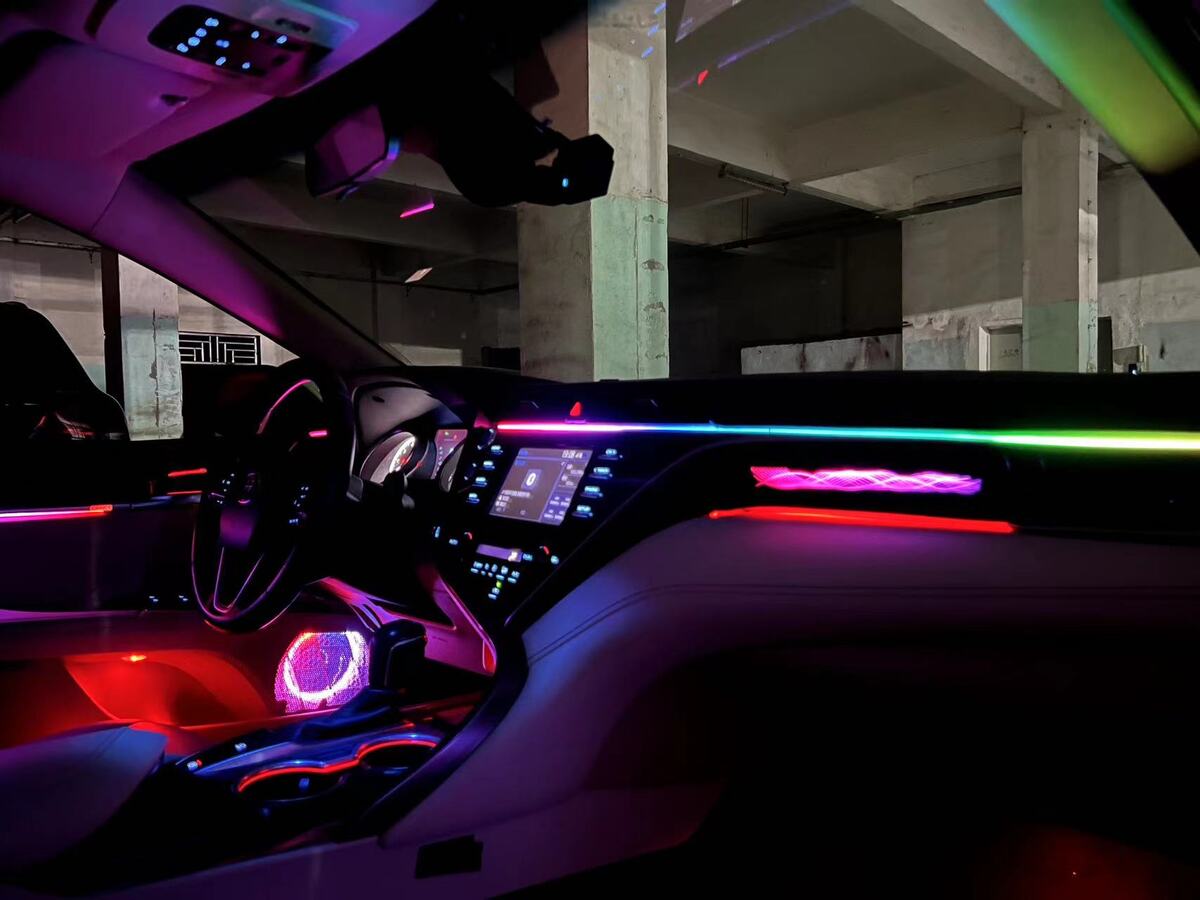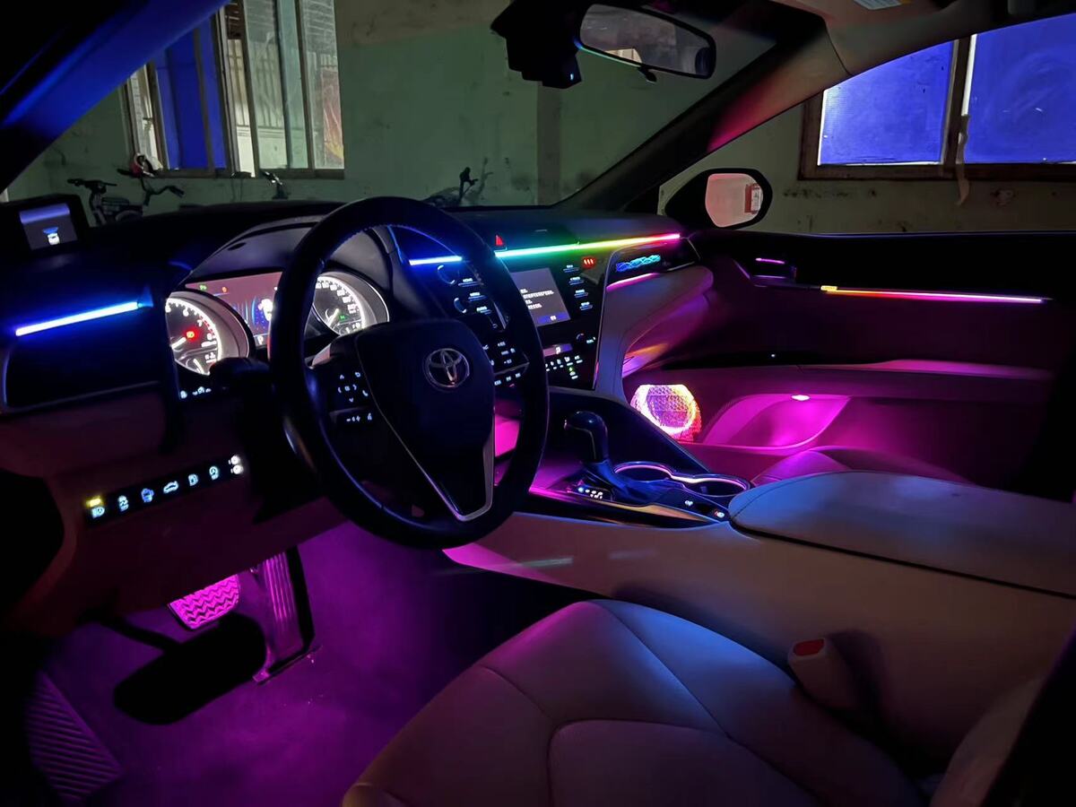 В комплекте: подсветка на стеклоподъёмники, подсветка ног и карманов, накладка с подсветкой на торпеду с надписью "CAMRY", подсветка передней, верхней панели, провода с блоками для подключения, подсветка в подстаканники, подсветка дверей (4шт.)