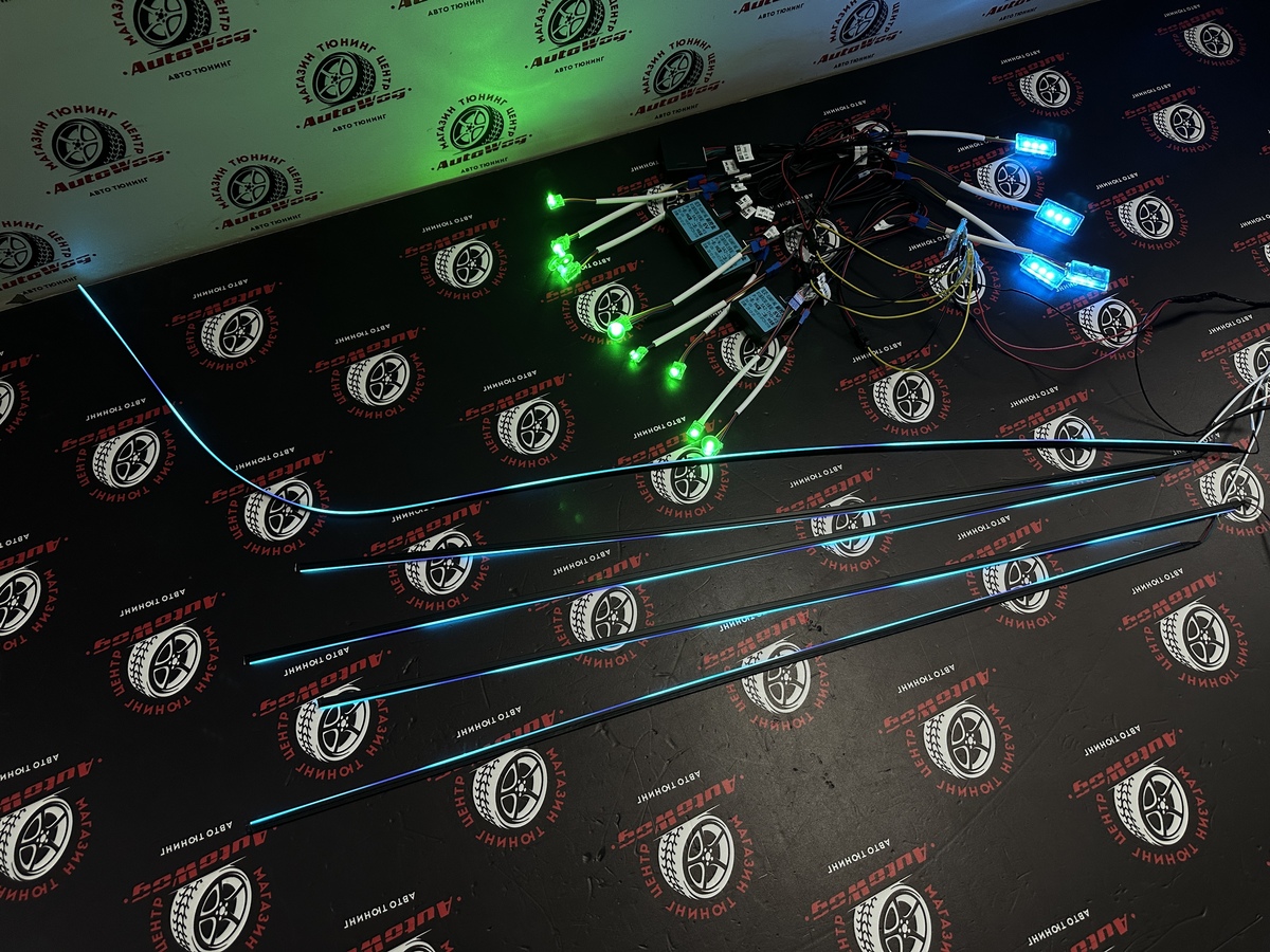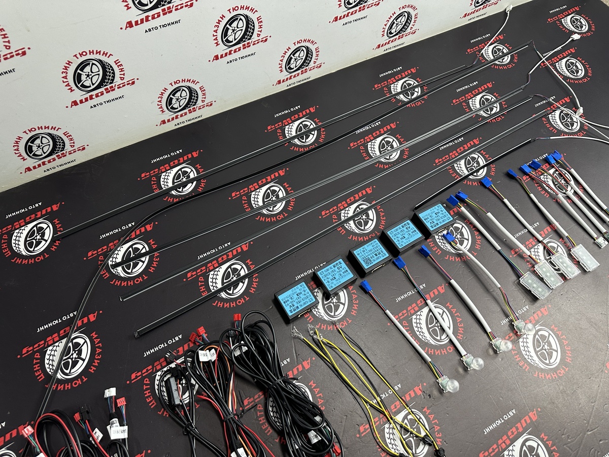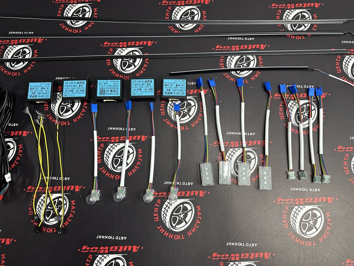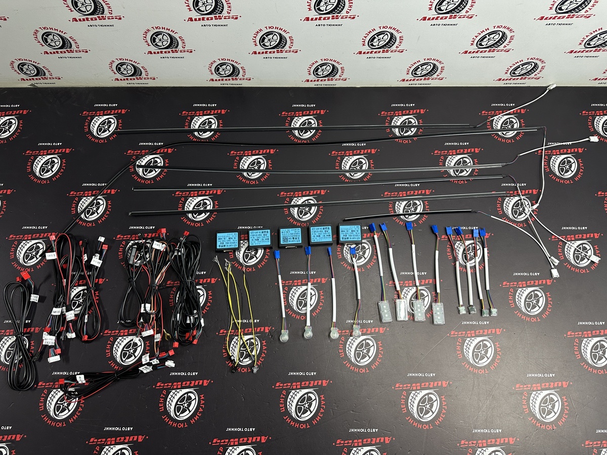 В комплекте: 6 диодных лент, 12 дополнительных подсветок (можно подсветку в ноги, в ручки подсоединить),  блоки управления, провода для подключения