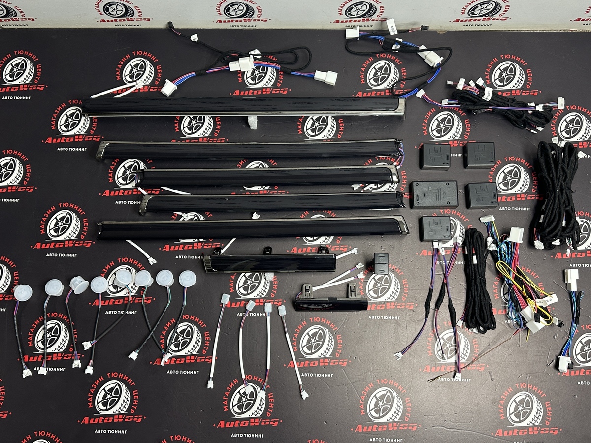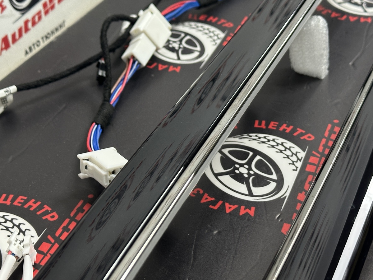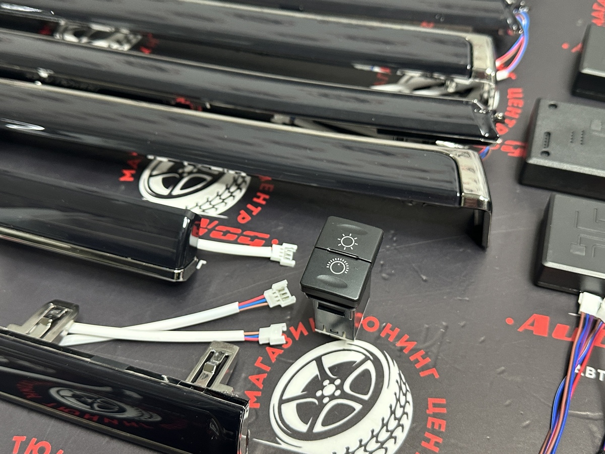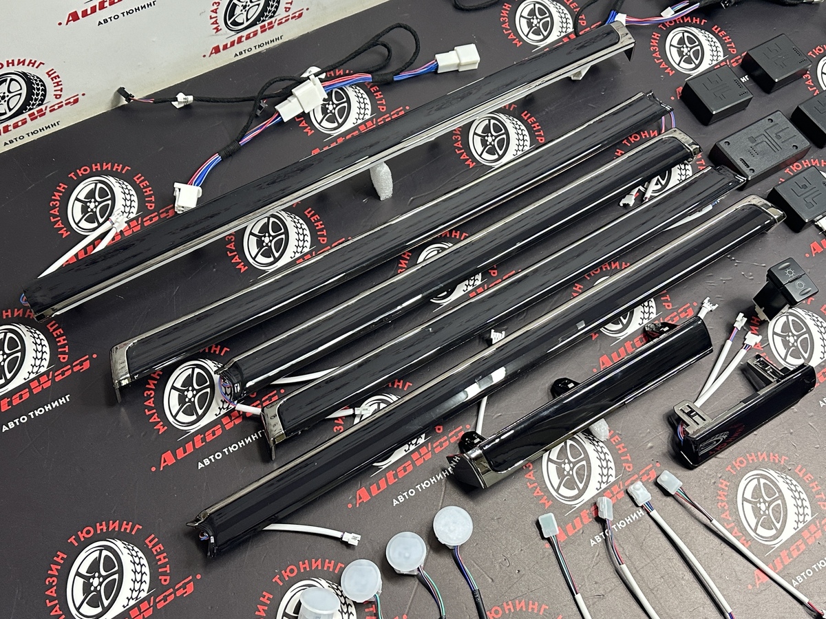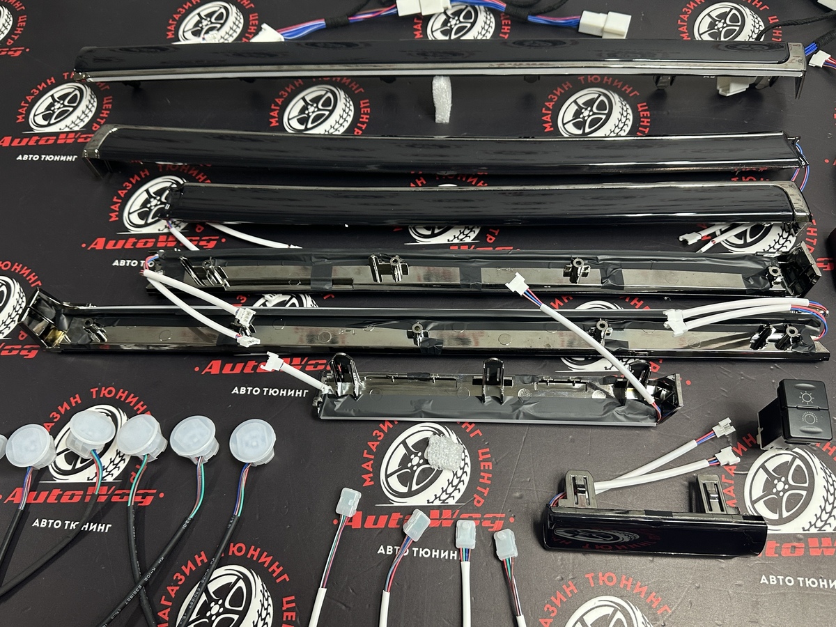 В комплекте: провода + блоки для подключения, 7 черных глянцевых с темным хромом накладки на торпеду, подсветки в ноги, в кармашки, кнопка (меняют цвета)