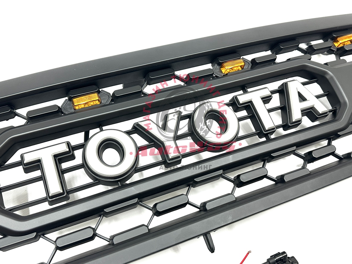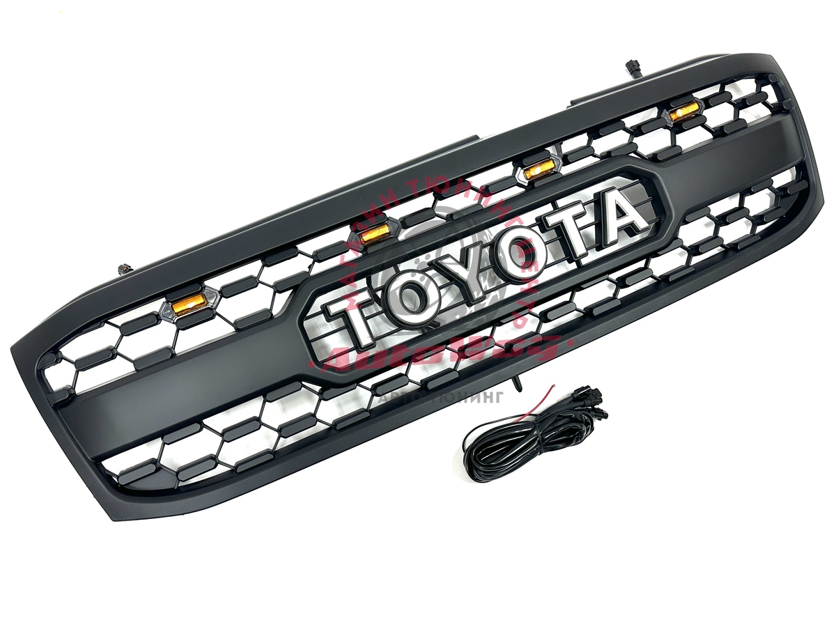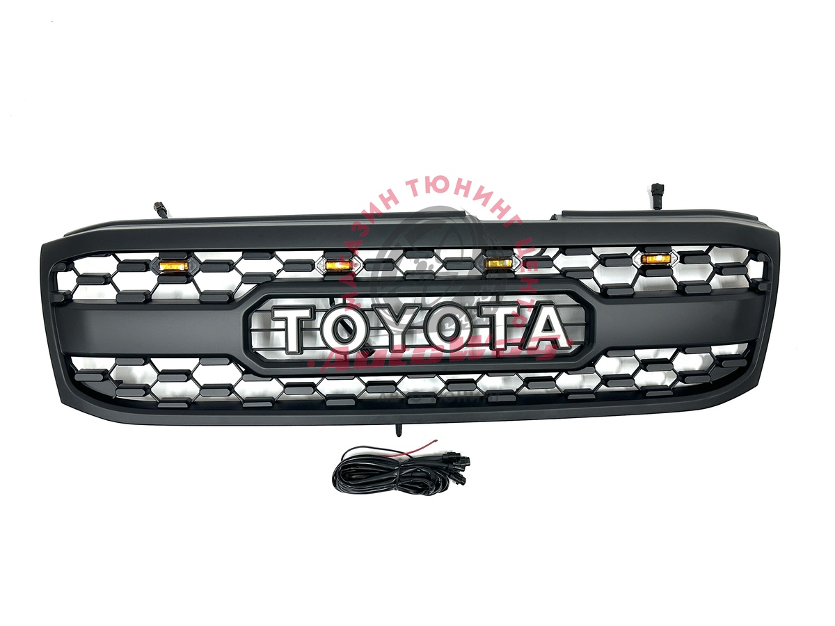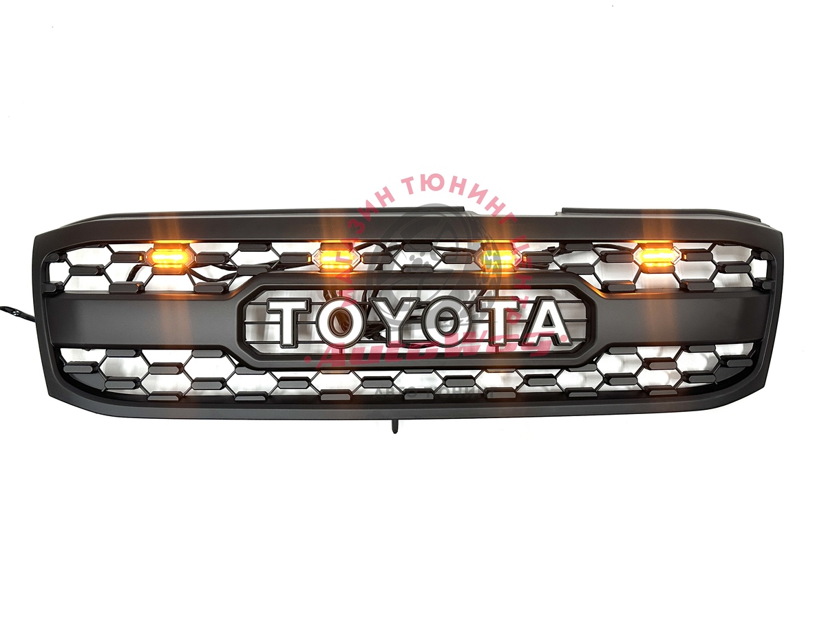 Решетка радиатора Toyota Land Cruiser 100 (1998–2003) в стиле TRD. Агрессивный внешний вид, крупная надпись TOYOTA, встроенные жёлтые ходовые огни.
