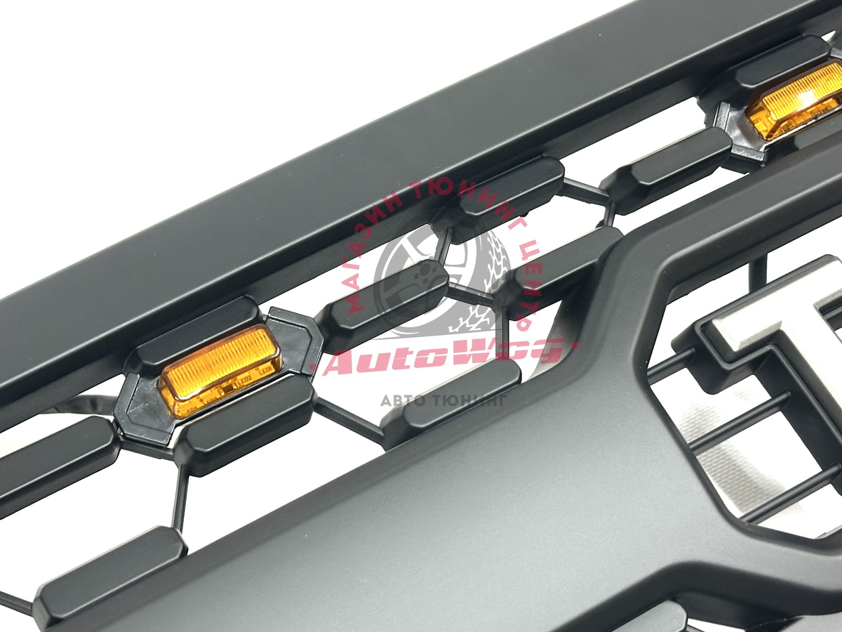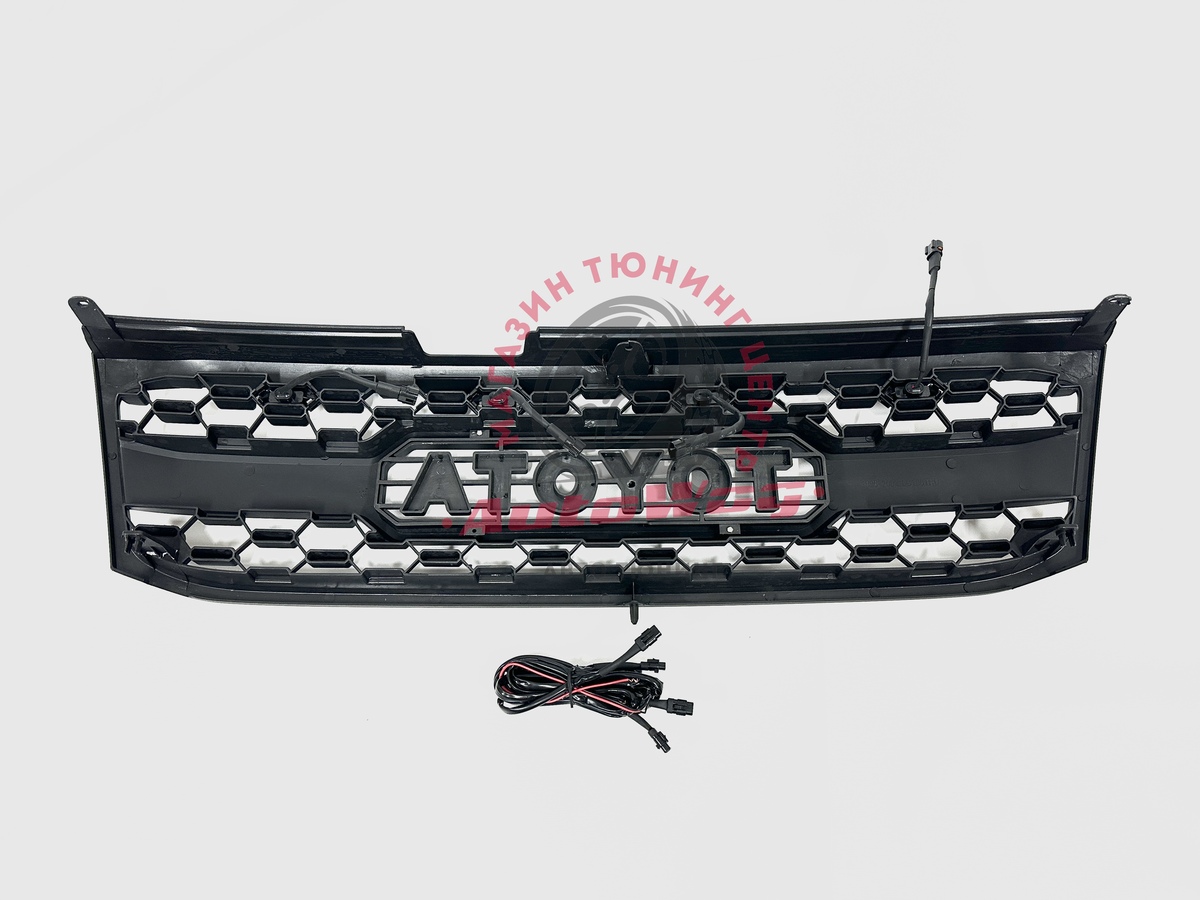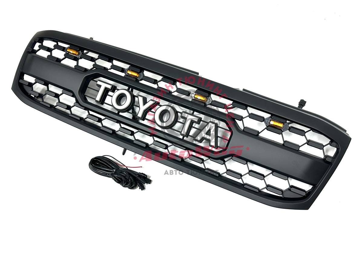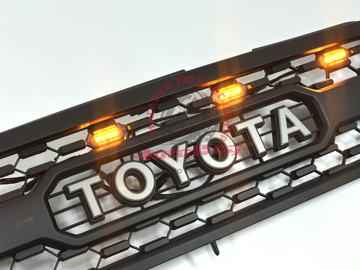Решетка радиатора Toyota Land Cruiser 100 (1998–2003) в стиле TRD. Агрессивный внешний вид, крупная надпись TOYOTA, встроенные жёлтые ходовые огни.