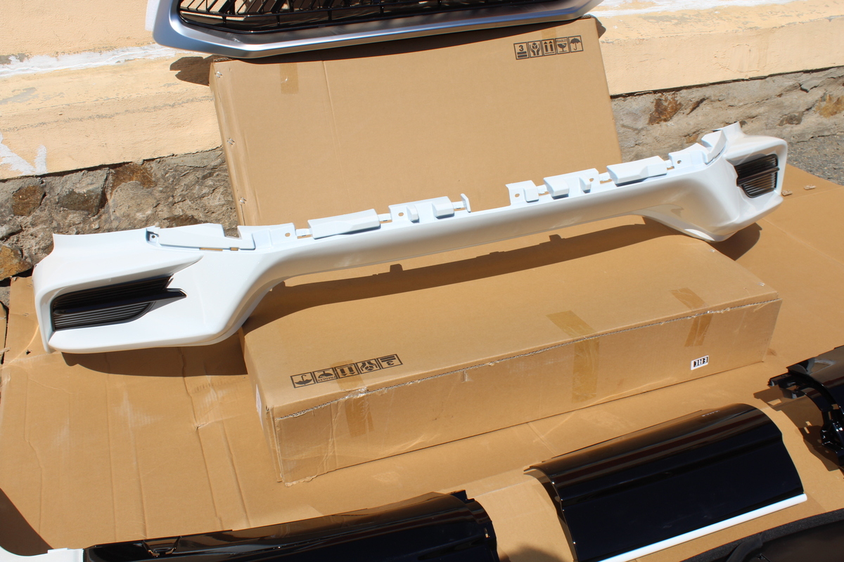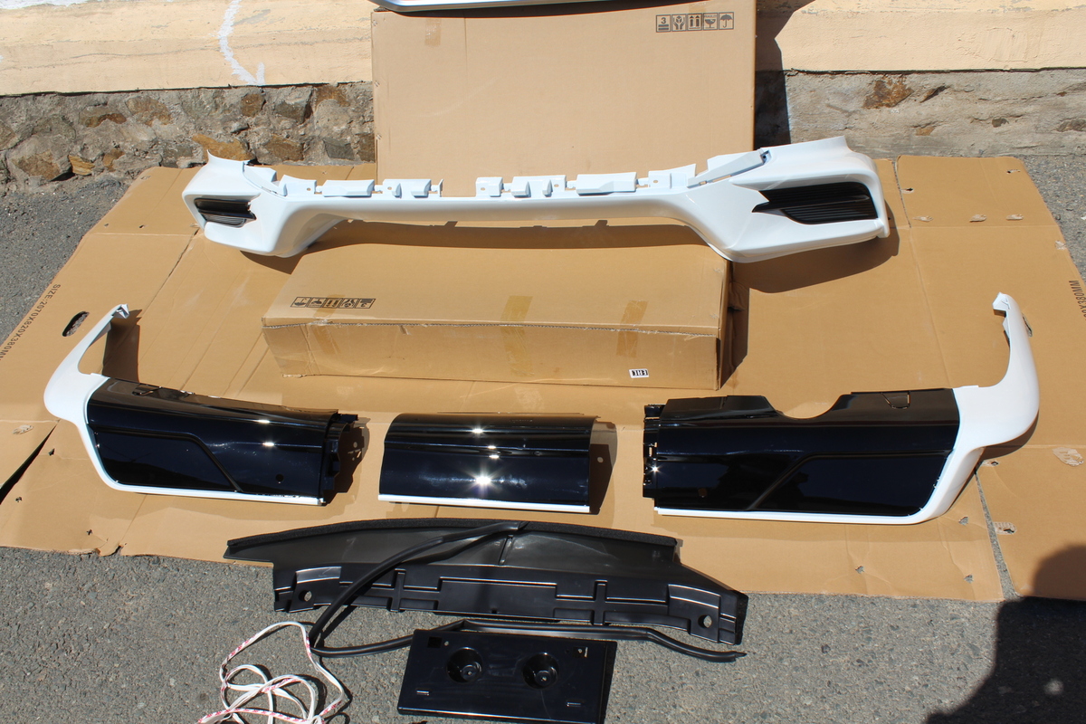 В комплекте: Решетка радиатора, передняя губа, задняя губа( из 3 частей),  накладка на решетку под гос.номер, диффузор, крепления,