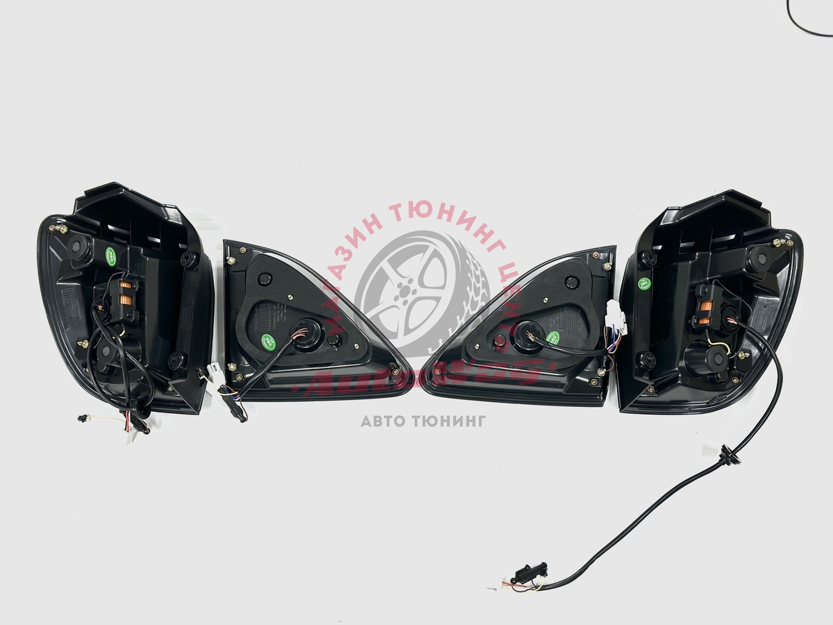 Полностью светодиодные (LED), с функцией динамического приветствия, выходящий в габарит, яркий бегающий повторитель поворота, задний ход