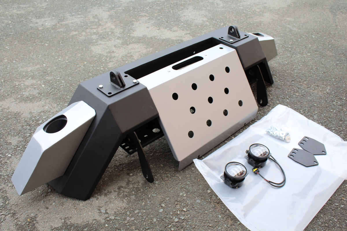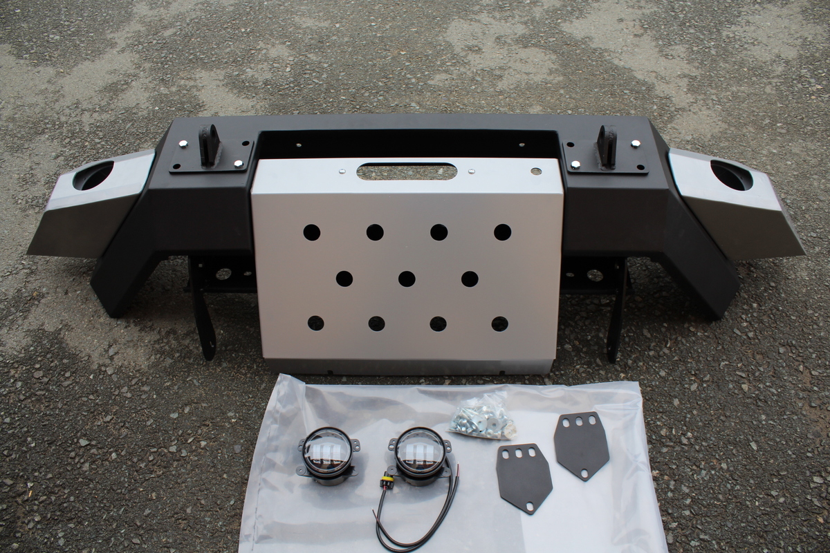 В комплекте к бамперу идут болты крепления и диодные противотуманные фары.